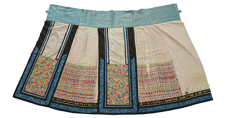 蓝色暗花缎地绣花鸟纹夹棉阑干马面裙  清  长118.2厘米 宽100.8厘米  北京服装学院民族服饰博物馆藏