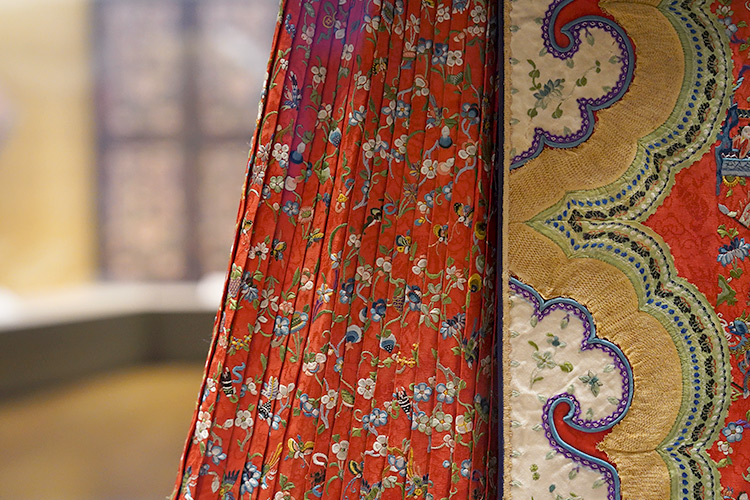 红色提花绸刺绣花卉纹阑干马面裙  二十世纪初长91厘米 宽177厘米  北京服装学院民族服饰博物馆藏
