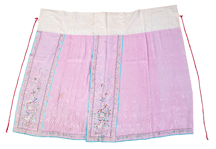 粉红暗花绸绣花鸟纹鱼鳞马面裙  二十世纪初  长104.5厘米 宽172厘米  广州博物馆藏