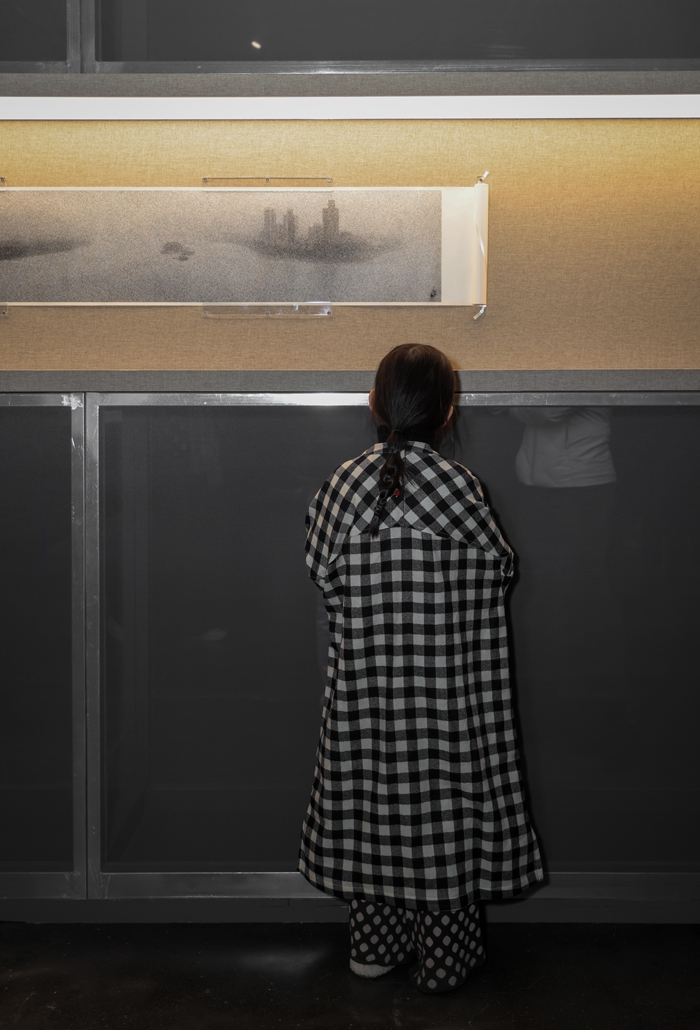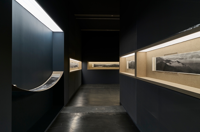 观众在展厅中的行走路径被精心设计,宛如漫步于园林或山径,视线在巨幅全景与微观细节之间转换,也随着景观的变化在黑白山水间穿梭。通过借鉴中国园林的“移步换景”理念,曲折的行进路径与错落的展墙关系引导着观者的步伐,从而延缓和延展其观看节奏和视角,在空间层面回应了秋麦作品所倡导的观看方式。