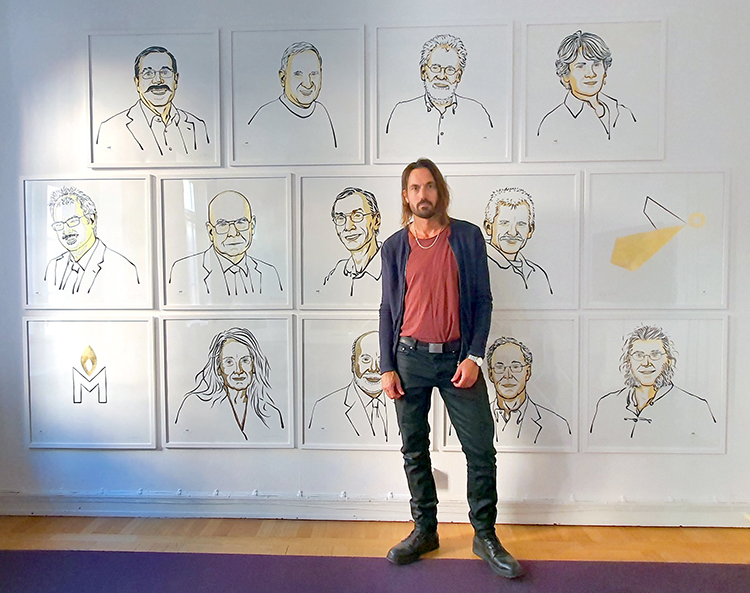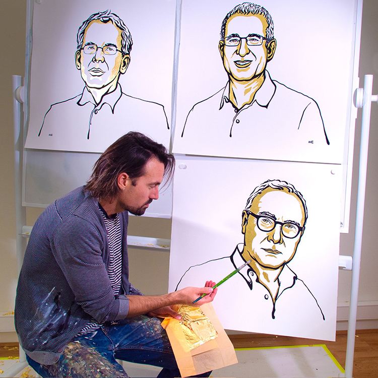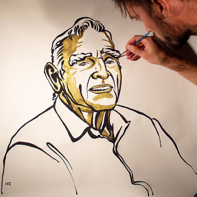 而在2017年时,诺贝尔奖委员会决定以金色呈现获奖者名字,于是尼克拉斯从2018年开始将金色元素融入到肖像画中。画像上的金色部分使用的并不是普通的金色颜料,而是一种可以用特殊胶水涂在画上的超薄金属箔。这种独特的绘制技巧,使得白色背景上的金色部分与黑色轮廓相映成趣,为画像增添了别样的魅力。