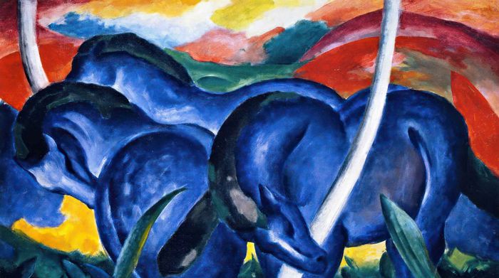 与此同时,在西方现代主义浪潮中,马的形象逐渐脱离经典写实框架,在照相术发明之后,艺术家开始从各个角度寻求艺术除了写实之外的意义。德国表现主义画家弗朗茨·马克笔下的《蓝马》就以非现实中的颜色将马表现为几何形态,在他的画中,蓝色象征精神与纯洁,表达对工业文明的反思与对自然本质的追寻。