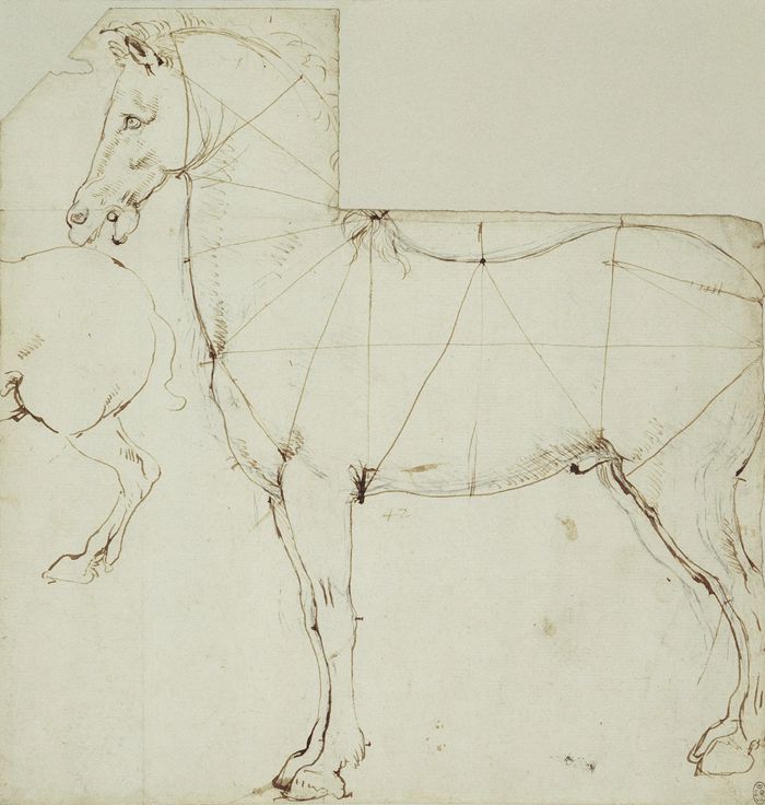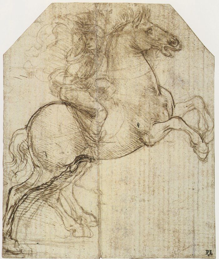 西方中世纪艺术倾向于表现上帝的庄严与神圣,而非客观世界。因此马多见于宗教手抄本或骑士题材,形态程式化,成为象征符号。直至文艺复兴,马重新获得科学观察的目光,进入艺术家的表现视野。达·芬奇是其中的代表人物,1482年他受米兰公爵委托,创作一座高达8米的斯福尔扎青铜马雕像,期间创作了众多关于马的素描手稿。这位文艺复兴巨匠以科学家的严谨研究马的结构、比例、动态,用线条解构生命,用科学诠释动感。