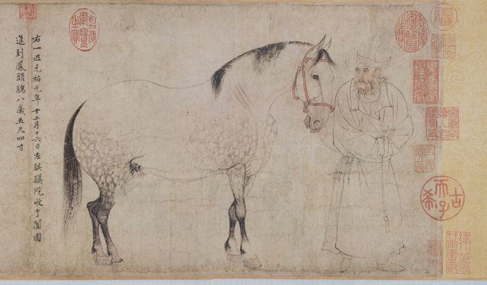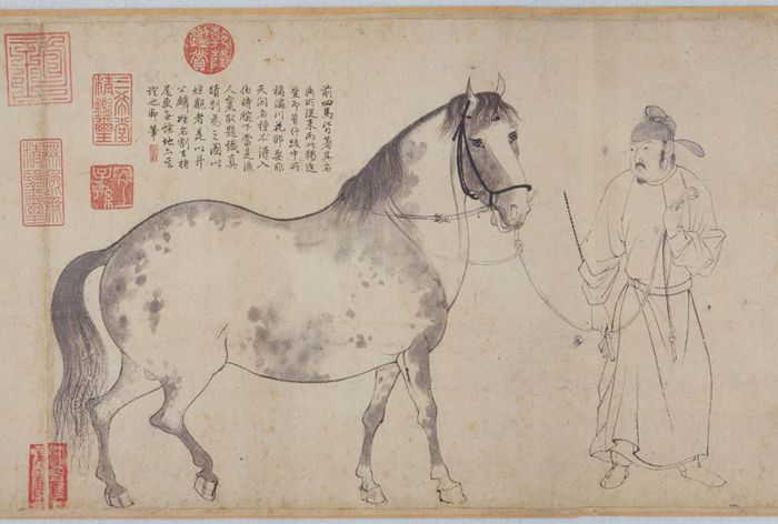 在东方,文人画兴起之后,对马的描绘转向心绪的表达。李公麟 《五马图》创作于北宋元祐初年,用白描的手法表现出西域进贡给北宋朝廷的骏马,五匹马各具美名,令人遐想。李公麟微施淡墨渲染,辅佐了线描的表现力,使艺术效果更为完善,体现了北宋简约、儒雅和淡泊的审美观。《五马图》对后世影响甚大,成为后世画鞍马人物的最佳范本。