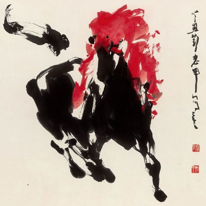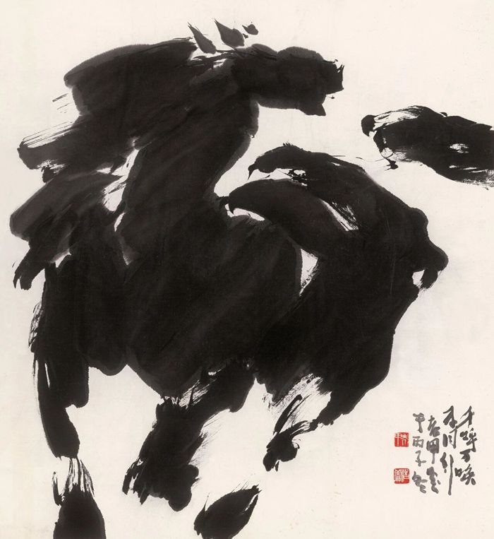 在近现代中国,最妇孺皆知的马当是出自徐悲鸿的笔下了。他因曾留学法国,深入研究解剖与光影,在归国后与中国传统的水墨表现技法相结合,形成了颇具民族精神的马的形象。徐悲鸿往往画的是高头大马,马腿健壮修长、马尾飞扬,墨色酣畅淋漓,既有西方坚实的造型基础,又含有中国奔放的写意精神。抗战时期,他常画奔马题材义卖或赠人,那昂首嘶鸣的形象成为唤醒国人、鼓舞斗志的精神象征。